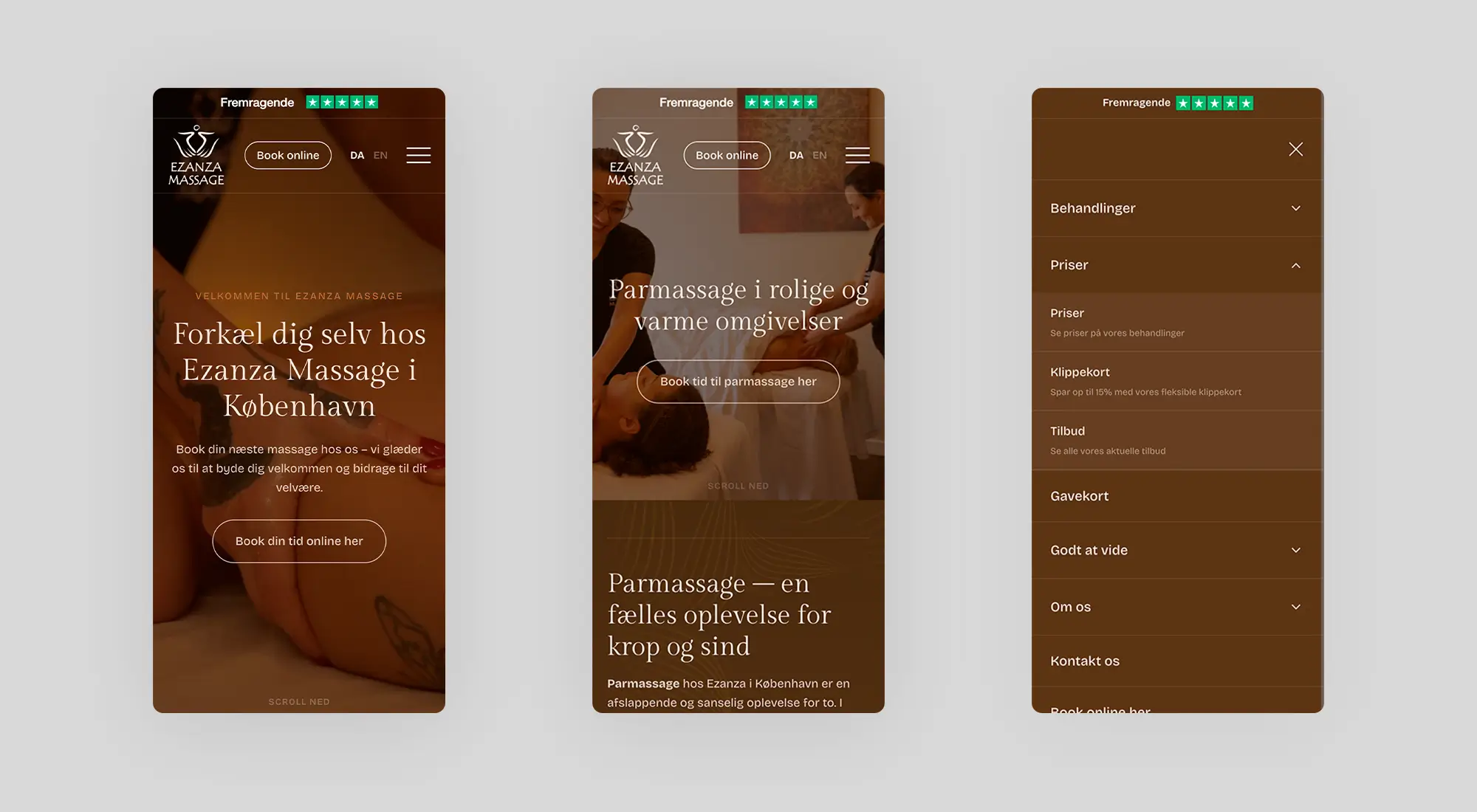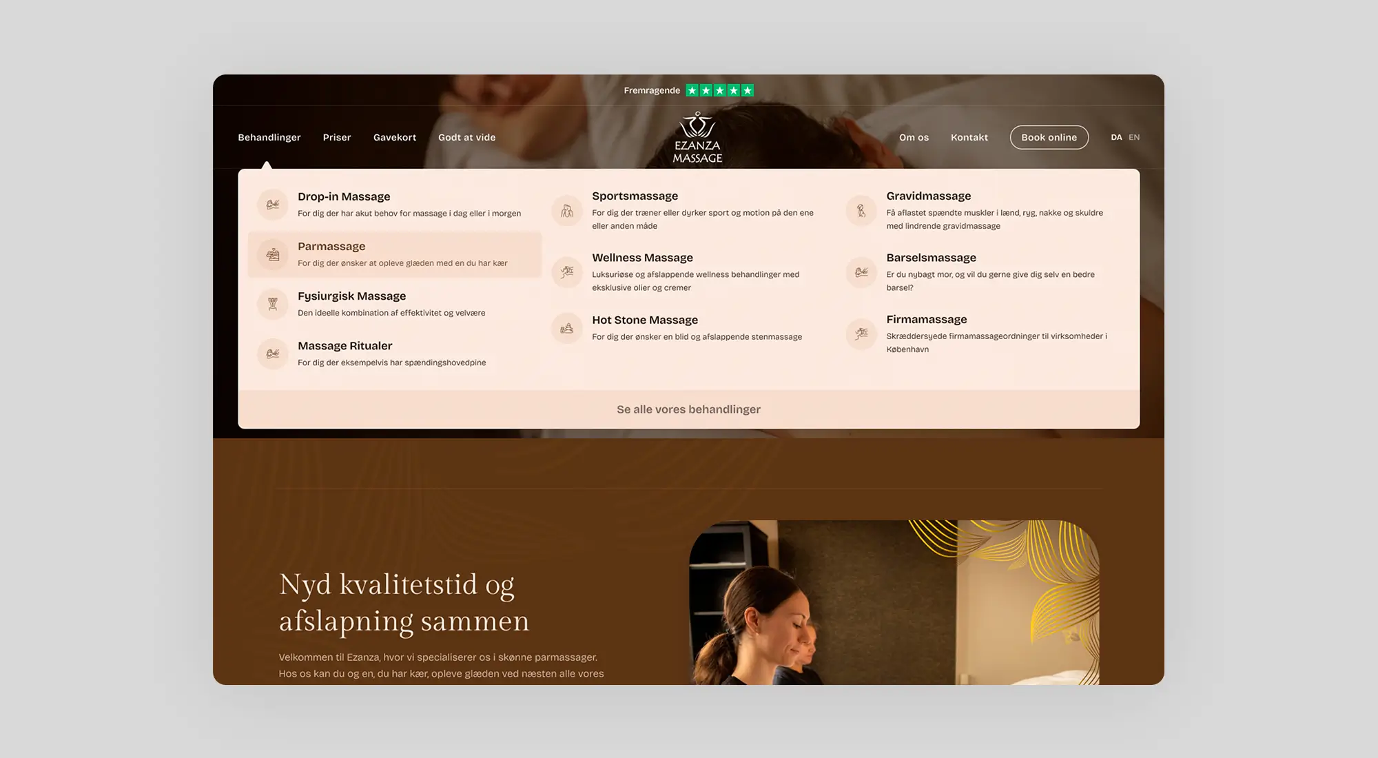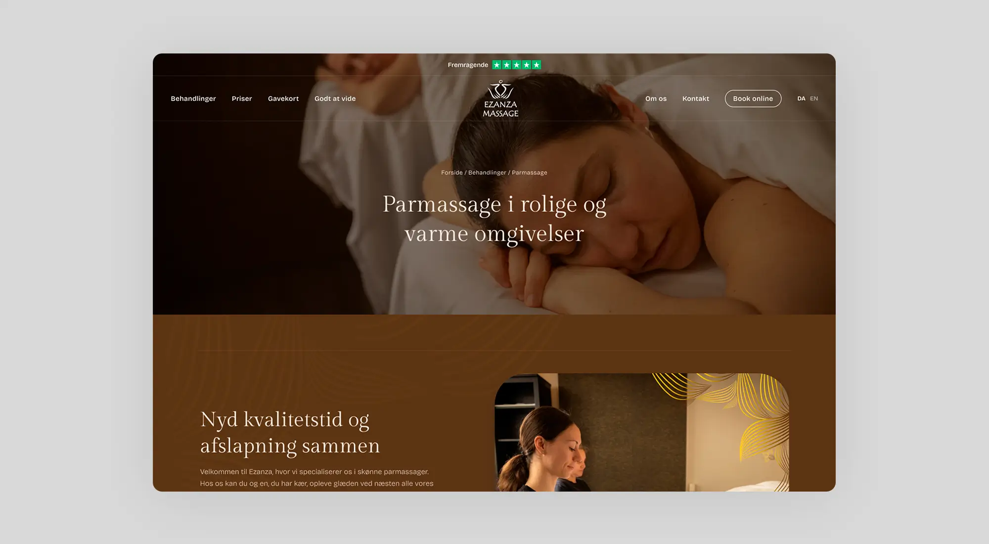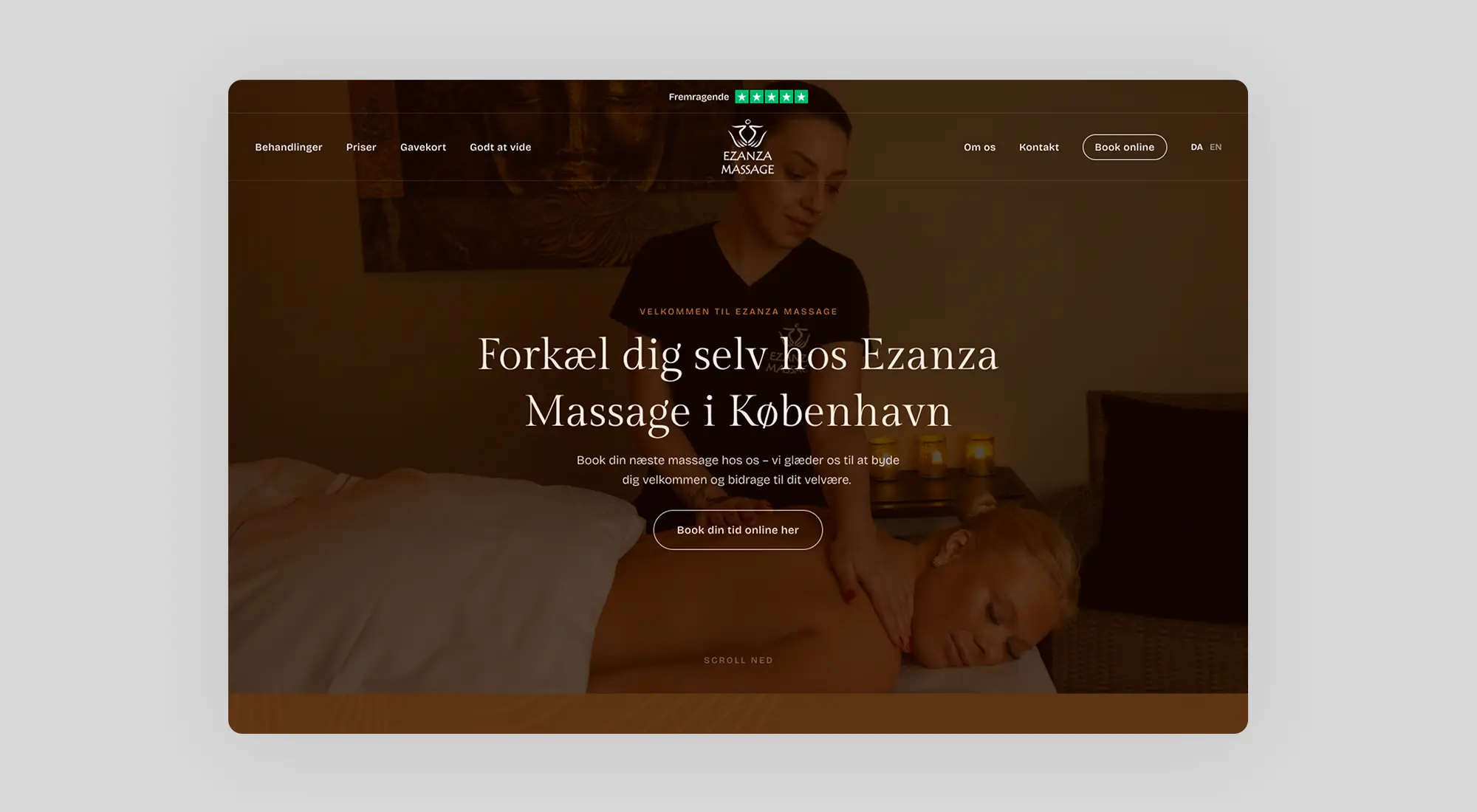 Med udgangspunkt i Ezan­zas egne ønsker til farver, fonte, grafikker og billeder har vi designet og udviklet en helt ny hjemmeside, der skaber ro, indbyder til tillid og fremhæver deres høje serviceniveau. Det var vigtigt, at de mange gode kundeanmeldelser blev en synlig del af brugerrejsen – så nye kunder straks kan se, at Ezanza Massage er vellidt og anerkendt.